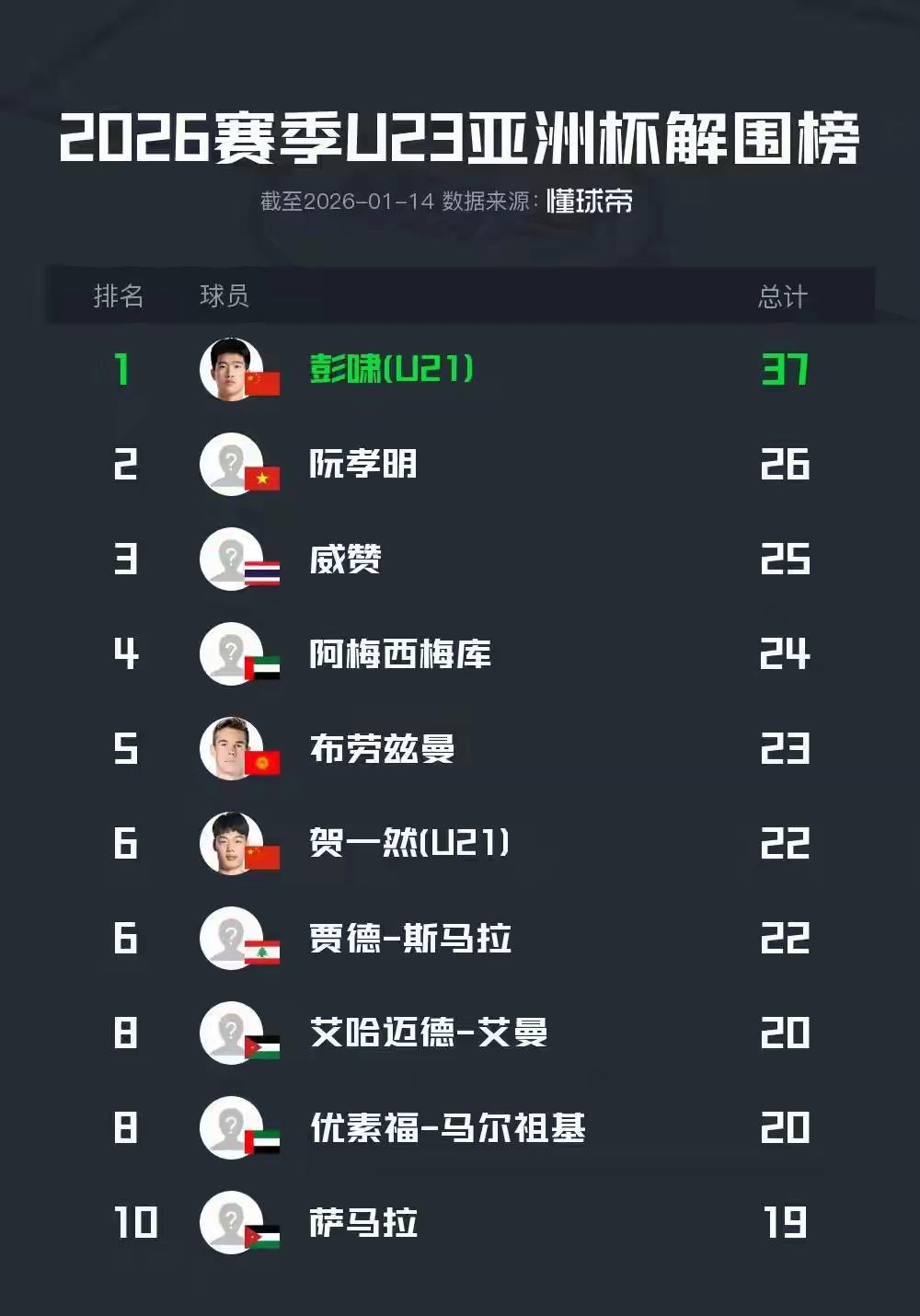 除了彭啸的挺身而出,另一位中国小将贺一然也交出了令人满意的答卷。他以22次解围的数据位列解围榜第六名。在一支强调防守的体系中,能够有两名球员同时闯入解围榜前列,绝非偶然。这反映出中国U23队在防守体系构建上的成功,也体现了年轻球员们在执行战术时的坚决与投入。彭啸与贺一然,仿佛是中国队防线上的“双塔”,用一次次奋不顾身的飞身封堵和卡位,守护着球门前的安宁。